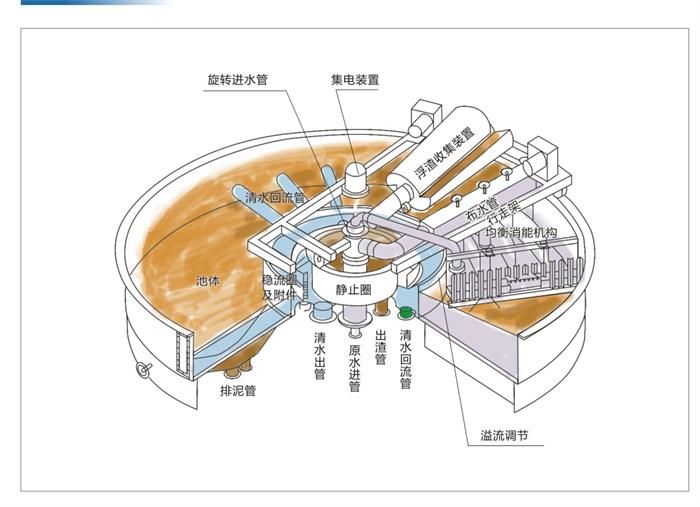 原水由水泵泵入气浮装置的原水进管,经旋转分配管均匀的分配入气浮池底部;经溶气系统加压溶气的溶气水经中心管进入分配器,与原水一同分配入气浮池底部。混合溶气水在溶气池底部因压力骤减而产生大量微米级小泡,在絮凝剂作用下形成的原水有机物团和悬浮颗粒被小气泡吸附上升至水面,形成浮渣,浮渣由刮渣系统清理排出。